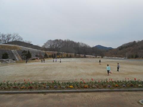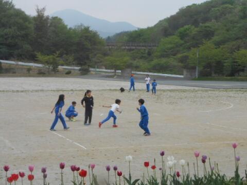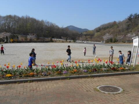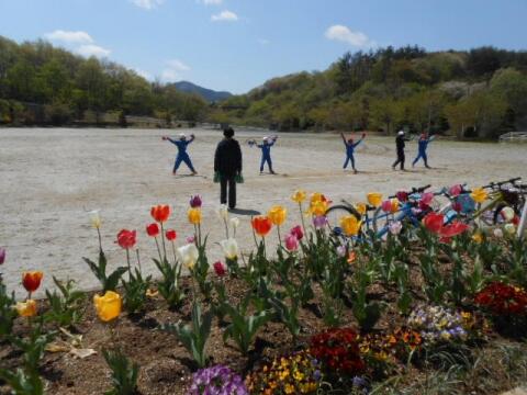 全児童は、朝から元気よく校庭で遊んでいます。チューリップも咲きそろってきました。