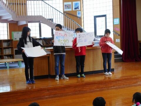 3年生:「みんなで校庭で遊んだ。4月からは1年生にも声をかけて遊びたい。」「遠足で、4年生が問題を出したので、自分も作りたい。」「持久走大会ではスピードを下ろさないで最後まで頑張った。」「神楽は難しかったけど楽しかった。4年生になるのが楽しみです。」