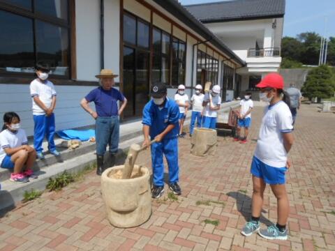 土を細かく砕き、粘土にしていきます。2つの班に分かれて、臼と杵を用いて土を砕きました。