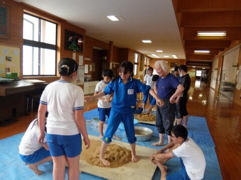 高学年の総合的な学習の時間「窯を調べよう」では、いよいよ土づくりに取り組み始めました。