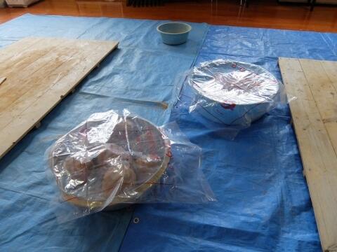 前回、杵と臼を使って細かく砕き、小石やごみを取り除いた粉の状態の土に水を加え、何度も踏みました。