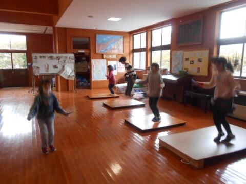 低・中学年は、業間にも練習に励んでいます。縄跳び用の板を使うと、跳びやすくなるようで、いろいろな跳び方に挑戦しています。