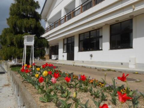 階段脇の花壇にも色とりどりのチューリップが咲いています。