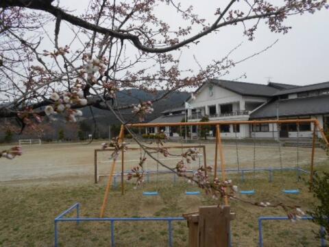 市内では、先週末に桜が開花しました。校庭の桜も、ほころび始めています。