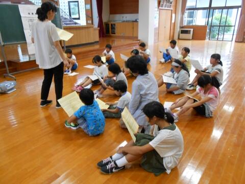 登場人物に合わせて声を変えたり、場面ごとに抑揚を付けたりしてとても上手に読み、聞いている児童たちは、紙芝居の世界にすっかり引き込まれていました。