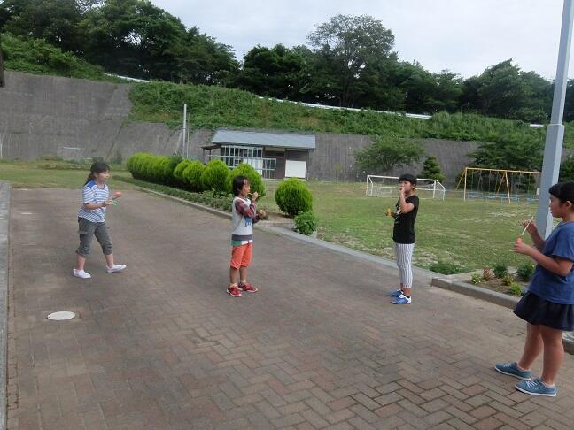 科学工作クラブ シャボン玉液を作って飛ばしました。