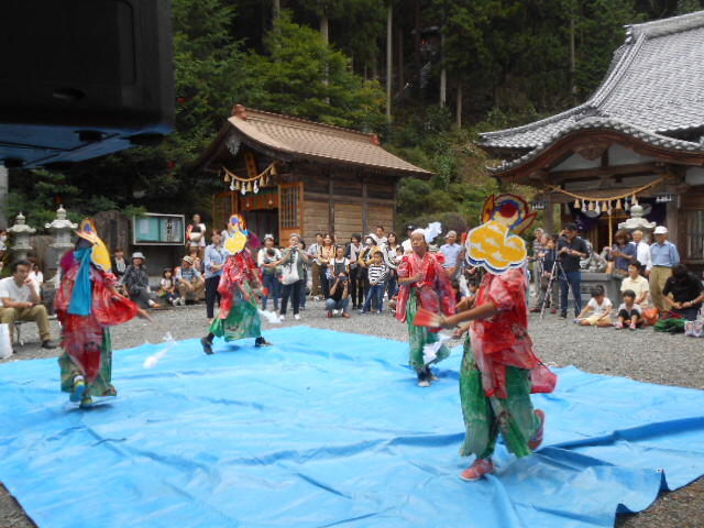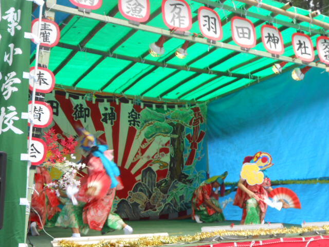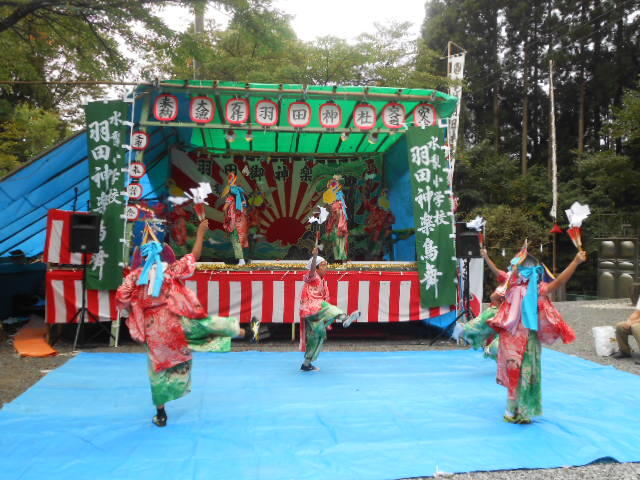 本校児童は、お山がけを無事終了して下山してきた幼児や付き添い(父親は付き添えません)、ご家族の皆様の前で「鶏舞」を披露しました。