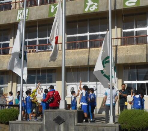 開会式では、「松岩地区ドッヂビー大会」で優勝した本校児童が国旗・市旗等の掲揚を担当しました。