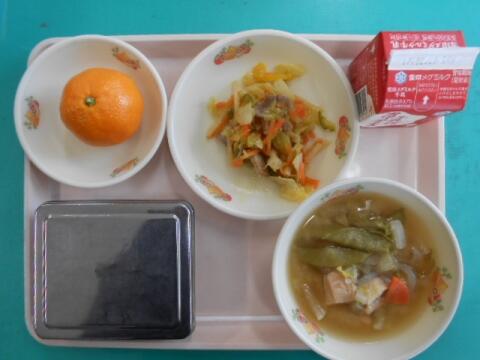 主なメニュー:豚肉と野菜のいためもの、石狩汁、みかん