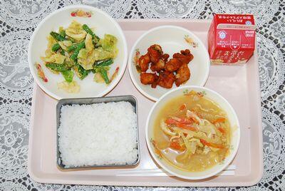 ささみのレモン煮(リクエストメニュー) キャベツのサラダ 坦々春雨スープ(リクエストメニュー) ごはん 牛乳 お祝いクレープ 737㎉