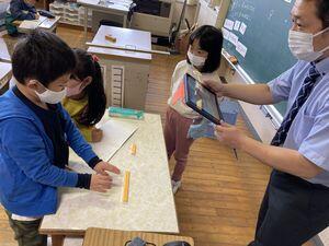 3年生の理科では,「時間がたつと,かげの向きがかわるのはどうしてだろうか」という学習をしていました。かんさつ2で太陽の位置が変わることを確認し,今日は記録用紙を作り,方位磁石で方位を調べ,定位置から午前・正午・午後にかげと太陽の向きを記録していました。社会科で学んだ方位が,理科の授業にも生かされているのですね。