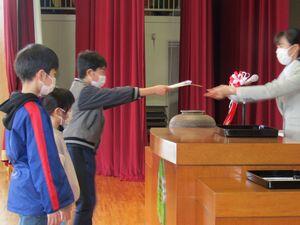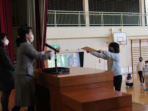 今日は令和3年度の最後の授業日でした。1時間目には修了式を行い,学年代表の児童が修了証書を立派に受け取りました。「1年を振り返って」の作文発表をした1年の小山さん,5年の秩父さんもしっかりした態度で,堂々と作文発表を行いました。