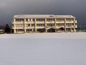 ↑ 校庭の雪は強風で半分くらい飛ばされてしまいました(T_T)