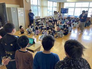4年生は「総合的な学習の時間」で“守ろう!ふるさとのまち・伝統”をテーマに学習を進めています。今日は大漁唄込み保存会の鈴木様と戸羽様にご来校いただき,崎浜大漁唄込みの歴史について学習をしました。戸羽様には手作りの紙芝居を用い,大漁唄込みの発祥や「天運循環」(幾多の浮き沈みを乗り越える不屈の闘志)という言葉をとても大切にしていること,鈴木様からは,今手元に残っている最古の大漁半纏(明治43年)をご披露いただきました。子供たちからの質問にも丁寧にお答えいただきました(センターで歌う人はどのような方ですか? 掛け声には意味があるのですか? なぜ櫂を打ち付けるのですか?等)。地域の中で共に歌ったり踊ったりして育まれてきた郷土芸能を,後世に伝えていくにはどのようにすれば良いのか,じっくり考えさせていきたいと思います。