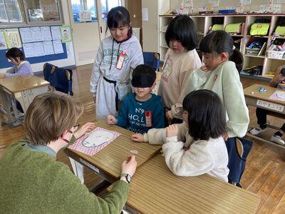 今日はALTのグレイ先生が来校しました。1年生の教室では,顔の部位の英語を教えていただき(目・鼻・ほっぺ・まゆ毛・耳など),英語で「○○をください」とペアに伝えての“福笑い”を楽しんでいました。