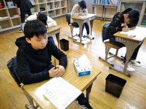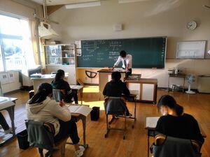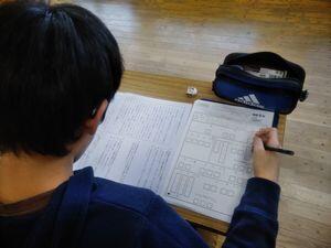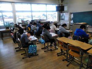 今日の5,6校時,書きぞめの席書大会を行いました。席書大会とは,字の通りで,自分の席で作品を書く大会です。審査会の公平性を担保するために気仙沼地域で行われています。