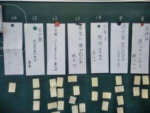 先生が作者名をふせて全員の句を提示します。子供たちは各自が良いと思った句を二つ選び,作品の下に付箋紙を貼ります。