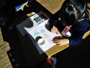半透明の紙にお気に入りの絵や模様を書き込みます。ランプで照らし出されると,この模様が浮かび上がる仕掛けのようです。(きっと,お盆の回転する灯籠みたいなものでしょうね。)