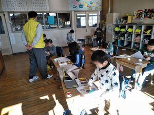 1年生はなにやらみんなで作業中。色紙を見て何をしているのか分かりました。6年生を送る会のメッセージ作りですね。協力して飾り付けをしたりメッセージを貼り付けたりしていました。