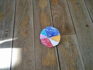 コップなどを写して書いた円に,思い思いの模様を付けます。ハサミで丁寧に切り取って,爪楊枝の心棒を付けたらできあがり。