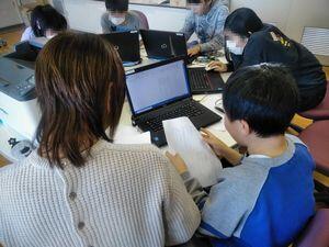コンピュータ室を覗くと,PCを使ってそれぞれが作業していました。オルレコースの花を紹介するページを作っているグループ,オルレコースそのものの見所を自分たちが歩いた時の写真を提示しながら説明するグループ,周辺の見所を紹介するグループ(自分の家のお店の紹介だね。しっかりPRしてね。),カルタを作っているグループなど様々です。