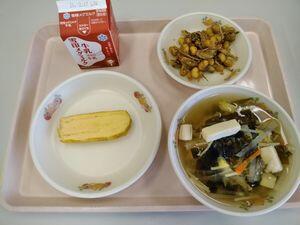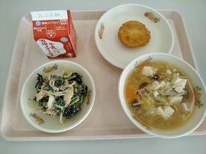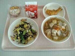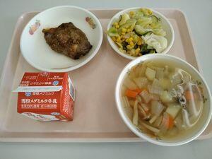 ささみのレモン煮 お手軽!かみかみサラダ みそけんちん汁 お米のタルト 牛乳