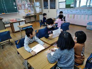前の時間に書いた「紹介カード」を基にして自分で読んだお話について,おもしろかったところをグループで紹介し合う学習です。
