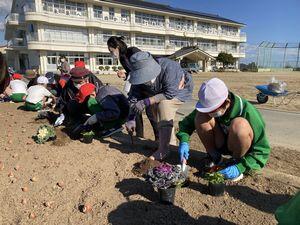 今日は「秋のグリーンデー」です。3年ぶりに「いきいきサロン」の皆様にお出でいただき,グリーンデー前には除草作業や剪定作業,グリーンデーの植栽作業が始まってからは,児童と一緒に植栽作業を行っていただきました。「浅く植えると霜にあたるから少し深めにね」「球根は尖っている方を上に」などと優しく声を掛けていただき,地域の皆様との活動を楽しみながら行うことができました。