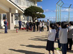 今日の2時間目に,気仙沼消防署唐桑出張所の6名の所員の皆様に御来校いただき,火災想定の避難訓練と初期消火訓練を実施しました。避難訓練では,避難の約束の「おかしも」に低学年優先避難の「て」が加わったことを教えていただきました。自分の身は自分で守るのが災害の時の基本といますが,困っている人がいたら,可能な範囲で気配りしましょうと私からも話しました。