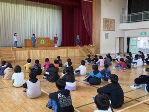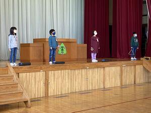今日は業前に歌声朝会を開きました。担当したのは1年生の4名です。「さがしてみよう ならしてみよう」の曲では,歌と楽器(トライアングルとすず)をうまく組み合わせて発表しました。その他にも「なかよし」「きらきらぼし」ではピアニカを堂々と演奏し,5年生,2年生,4年生の代表者から「きれいな演奏でした」「3曲も発表してすごいと思いました」などの感想が寄せられました。