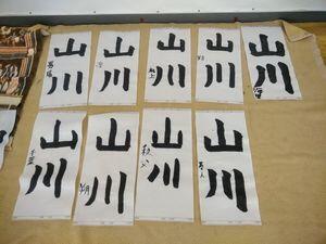 先ずは,ほぼ何も教えずに1枚を清書用紙に書きました。お題の「山川」は縦画と横画がたくさんあり,バランスを取るのが難しいお題です。