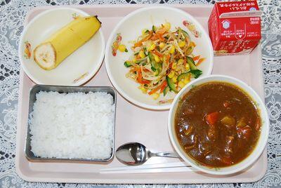 今日はさきいかを使ったかみかみサラダです。カレーの日はあまり噛まずに食べてしまいがちですが,サラダをかみかみメニューにしたので,意識して噛んでみてくださいね。よく噛んで食べると,だ液がよく出るようになり,歯の病気を予防したり,食べ物の消化を助けたりします。歯の健康は全身の健康につながります。飲み込む前にあと10回噛むことを意識してみましょう。