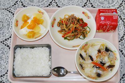 今日の給食は中華料理で揃えました。厳密に言うと,中華料理とは,中国から伝わって日本でアレンジされたもので,中国本場の料理は中国料理と呼ばれています。チンジャオロースーは細切りにしたピーマンや肉を炒めた料理です。「チンジャオ」はピーマン,「ロースー」は肉の細切りという意味です。ピーマンやパプリカが苦手な人もお肉と一緒に食べてみてください。かみかみ食材のたけのこも入っているので,食感を楽しみながらよく噛んで食べましょう。