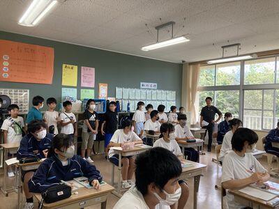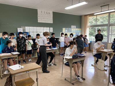 はじめに,体育館で交流活動をしましたが,6月にも修学旅行を一緒に楽しんだ経験がありましたので,リラックスしているように見えました。授業見学は学校ごとで,1年数学→2年理科→3年音楽の順に回ったのですが,初めて見る中学校の授業の雰囲気に圧倒されたようです。そんな中でも,知っている先輩を見つけて手を振ったりノートをのぞいたりと,時折笑顔も見られました。