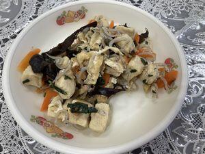 「かみかみメニューコンテストの入賞レシピ ゆで鶏肉とごぼうの梅和え」