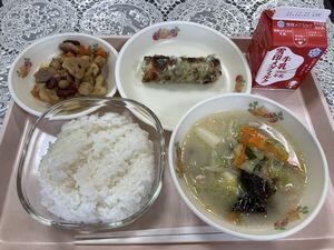 今日の給食では,かみかみメニューコンテストに応募があった中から,「トリ・豆・れんこん」が登場です。このレシピを考えてくれたのは,唐桑小学校4年生の伊藤亮人さんです。メニュー名のとおり,豆やれんこんなどのかみかみ食材を入れて噛み応えを出しています。また,タンパク質やビタミン、食物繊維など,いろいろな栄養素がつまったレシピに仕上がっています。よく噛んで食べましょう。