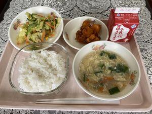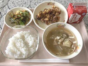 鶏肉は豚肉や牛肉に比べて脂肪が少なく,ヘルシーなのが特徴です。今日は人気メニューのささみのレモン煮ですが,ささみは鶏肉の中でも,より高タンパク,低脂質な部分です。タンパク質は筋肉など,体をつくるもとになる栄養素で,成長期の皆さんにとってはとても大切な栄養素の一つです。栄養のことも考えながら,おいしく食べてもらえると嬉しいです。よく噛んで食べましょう。