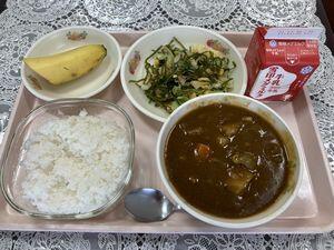 今日は人気メニューのカレーですね。カレーの日はエネルギーが高くなるので,副菜にはあっさりとしたサラダを合わせることが多いです。今日のサラダに使っている昆布は三陸産のものです。昆布は,サラダや煮物に使ったり,だしに使ったりと,いろいろな食べ方ができる食材です。おなかの調子を整える食物繊維やカルシウムなどのミネラルが豊富に含まれています。