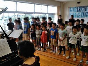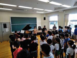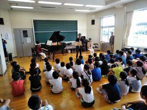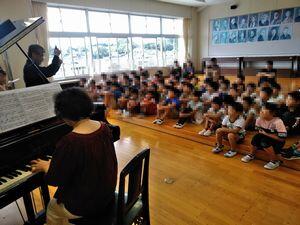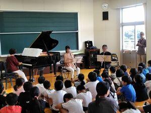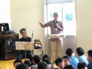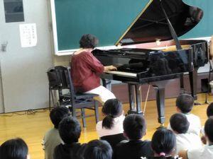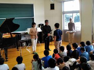 「だんだん小さく」(クラリネット,ピアノ),「水の戯れ」(ピアノ),「マ・メール・ロワ」(クラリネット2、ピアノ)の3曲を演奏していただいたあと,本校の9月の歌「赤い屋根の家」をみんなで歌いました。