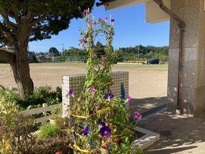 さて,今日は地区内にお住まいの村上様が来校し,素敵な生け花を飾ってくださいました。ちょうど業間の休み時間だったので,外遊びを楽しもうと階段を下りてきた数名の児童が,村上様を見つけるとすぐに寄ってきて,「こんにちは,いつもありがとうございます!」「なんていう花なんですか?」「ホチキス使うんですね」「クルリンという感じがいいですね」などと村上様に次々と話しかけていました。こういう会話を通して,いろんなことを学んでくことを改めて感じました。