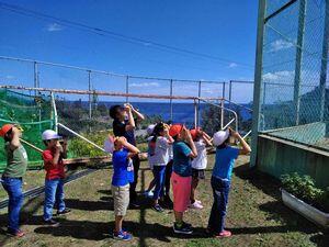 一つ目は,緑のカーテン。これはしお1のHくん,4年生がプランターで育てているゴーヤ,スイカ,ササギです。ゴーヤは支柱を越えて伸びたため,2階からネットを張って這わせています。子どもたちも気になって観察しています。