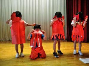 2年生は「サルかに合戦」です。カニの子たちはお母さんを亡くして泣いていました。はさみがかわいいですね。
