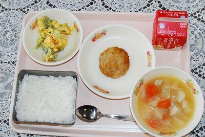 ししゃもやしらす,きびなごなどの骨ごと食べられる小魚には,カルシウムが豊富に含まれています。カルシウムは骨や歯をつくるもとになったり,筋肉を動かす時に働いたりします。カルシウムは成長期に多く体に吸収されるので,皆さんには意識してとってもらいたい大切な栄養素です。今日はししゃもフライです。小骨まで食べられるので,よく噛んで食べましょう。小魚が苦手な人もぜひ挑戦してみてくださいね。
