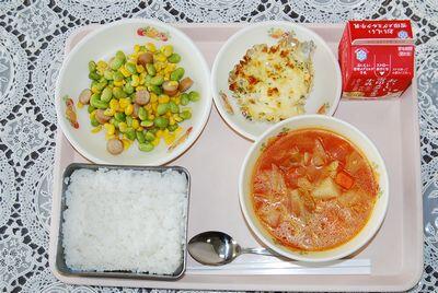 今日のメインのおかず「主菜」は,スペイン風オムレツです。スペインの代表的な家庭料理で,このオムレツの特徴は中にいろいろな具材が入っていることです。給食でも色とりどりの野菜を使いました。卵と野菜の栄養を一緒にとることができるのがよいですね。好き嫌いせずに食べましょう。