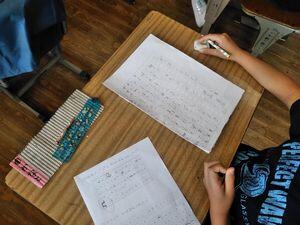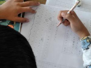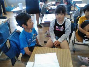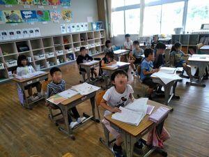 1年生は計算カードをめくりながら1桁の足し算を練習していました。2年生は取り組んだプリントの自己採点をしていました。