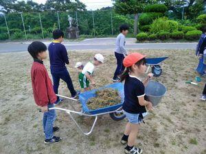 毎朝,教頭先生,水戸先生,玉川さんが校庭の草取りをしています。今朝は,玉川さんのところに4年生が手伝いに駆けつけてくれました。6年生も水戸先生にお手伝いしていました。校庭はもやっていましたが,心は清々しい気持ちになりました。みんなありがとう!