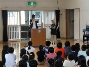 「家庭科室は何をする部屋でしょうか?」「音楽室には木琴があるでしょうか?」「図書室には本が百冊以上あるでしょうか?」など特別教室についての紹介をクイズ形式でしていました。