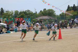 ↓令和4年5月に開催した運動会の様子です。種目は違いますが,フェンスには昔と変わらず大漁旗を掲げています。魚釣り競争は児童会主催の「青葉祭り」に出店される人気の出店です。