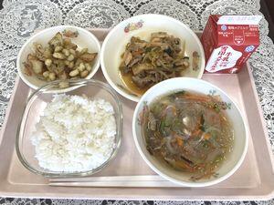 今日はリクエストが多かった青のりポテトビーンズが登場です。大豆には,体をつくるもとになるタンパク質が豊富に含まれています。また,食べたものをエネルギーに変えるのを助けるビタミンB1とう栄養素が豊富です。いつも残食が少ないメニューなので,今日もおいしく食べてもらえたらうれしいです。