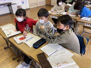 2年生は国語の学習で「ことばを広げよう」という単元を学習していました。今日のめあては「ようすをあらわすことばをつかって 文をつくる」です。このめあては,子供から提案されたものを担任の先生が「それはいいね,みんなはどうかな?」と投げかけ,全員が納得して立てたものです。2年生の授業は,いつも子供の発言やつぶやきを担任の溝下先生が上手に拾ったりつないだりしてめあてを立てます。まとめもそうで,いつも感心させられています。今の学習スタイルは,先生から全てを教えてもらうのではなく,児童が「自ら学ぶ」学習でなければなりません。今日の2年生の学習は,まさに「自ら学ぶ」そして「友達と一緒に考える」学習で,子供たちの生き生きと学ぶ姿を見せてもらいました。
